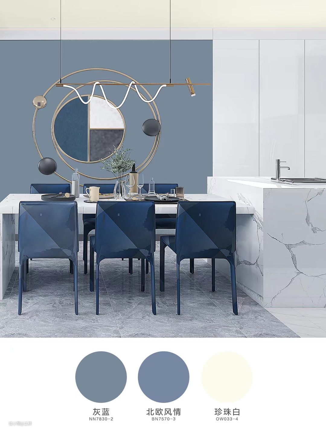 立邦色彩NN7830-2灰蓝典雅大气,富有现代感,大面积的高级灰蓝色与偏深的北欧风情互相映衬,不同的色调体现出空间的层次感,白色系家具更是锦上添花,不仅凸出了蓝色的高级,更平和了灰色的清冷,达到了提亮空间的作用。
