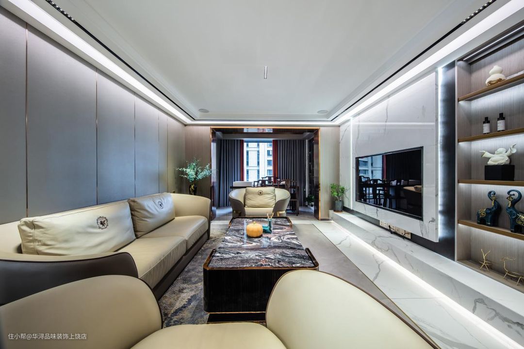 130㎡现代轻奢、时尚精致的客厅,皮质沙发高级感十足。