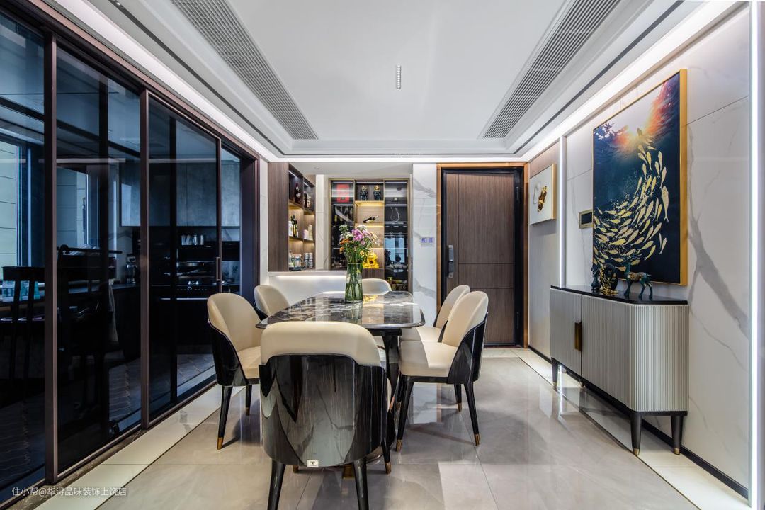 餐厅和客厅之间安装了金属材质的垭口,将两个空间隔开,增加空间层次感的同时,还能利用金色金属的光泽让空间更加华丽。