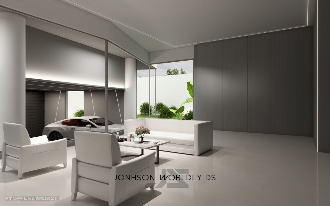 车库与负一楼的小型会客厅用大扇的落地玻璃窗进行区隔灵动大方,独特视觉。简约的灰白搭配也让空间内的高级感满满。