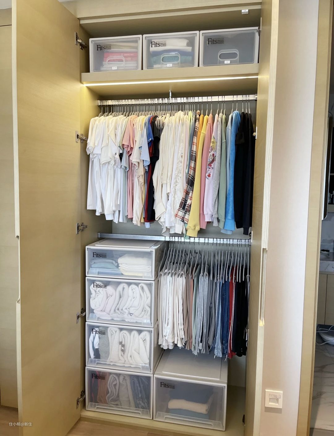 后来,我学习收纳达人,在挂衣区不变的基础上,将叠衣区换成叠放的抽屉式收纳箱,才发现,原来衣柜还能如此的整齐,原来整理一次也能一直保持。