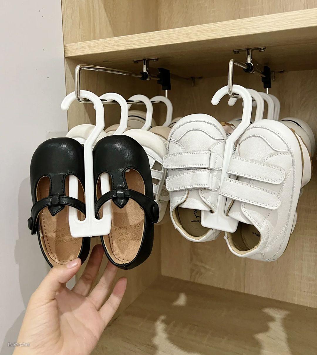 灵感来自超市拖鞋区,给鞋柜隔板上,装几根导轨,再用鞋架将鞋子挂起来,整齐、整洁。