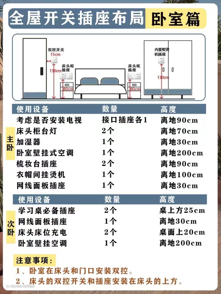 1.卧室主灯使用双控开关,预留在门口和床边。