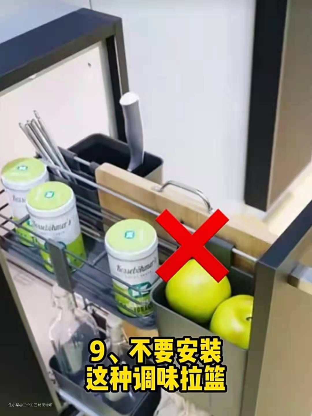 现在很多调料瓶身尺寸并不是一致的,稍微大一点就放不下,经常做饭的姐妹都知道,调料要放到台面上,顺手就能拿到才方便,尤其是大多数家庭调料拉篮都在锅灶斜侧方,每次做饭油都热了,再弯腰过去拿调料根本来不及,常用调料可以在燃气灶旁边加以一个小调料台,不常用的调料可以用宣传收纳盒放在油烟机上方的吊柜里,用的时候再拿出来也更方便。