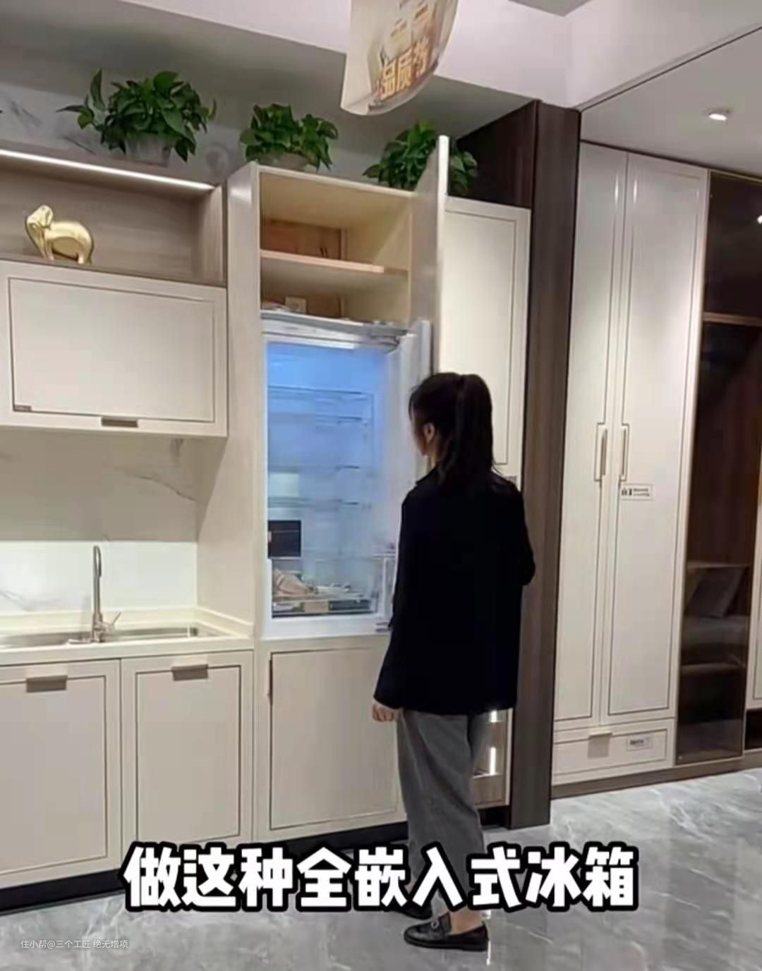一定要提前算好冰箱嵌入的深度和开门的角度,避免出现冰箱嵌入一半或者全部嵌入后,冰箱门不能全部打开的情况,如果要追求美观可以和设计师沟通做全嵌入式冰箱,可以把冰箱和橱柜完美结合,美观又方便实用。