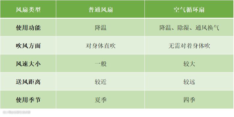 首先在使用功能定位上两者就完全不同,普通风扇只是单单用来降温的,而空气循环扇除了降温外,还有除湿、通风换气功能;在使用时,普通风扇都是对着身体直吹的,但空气循环扇使用时无需对着身体吹,它可以通过搅动室内空气使其发生对流,进而实现降温效果;在风速和送风距离上,空气循环扇要完胜普通风扇;另外还有使用季节,普通风扇就夏天用来降温,而空气循环扇在一年四季都有用武之地,因为它可以辅助空调或者暖气来均衡室内温度以及净化空气。