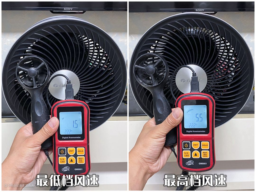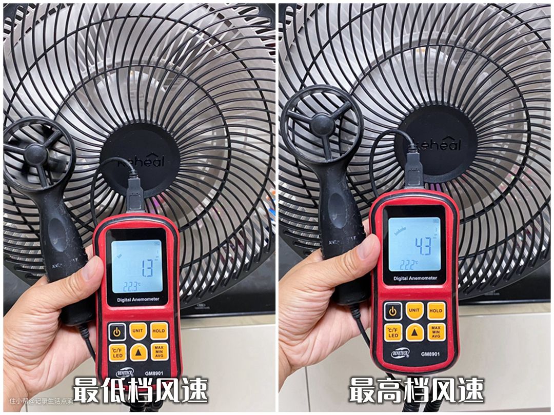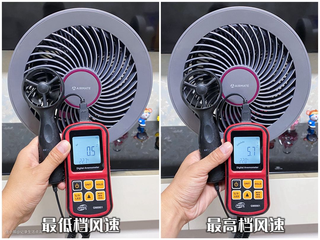 艾美特共有32档风速可调,也是它最大的亮点,可以调节处最舒适的风量。最低档风速实测为0.5m/s,最高档为5.7m/s。根据实际测得数据,艾美特的最大风速是这三款空气循环扇中最大的,而且最低档的风速也是很小的,实际测试时好几次均显示为0,这可能与细分的32档风量有关,最低档风量十分轻柔,以至于风速仪都无法测得,是专门为婴幼儿设计的轻柔风。