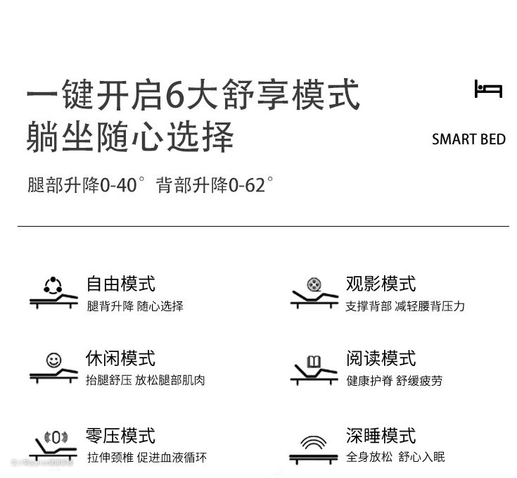 深睡模式:背部0°腿部0°,贴合人体七区,延长深睡时间