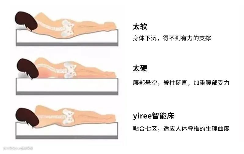 过软的床垫很松软,但因为支撑力度不够,身体陷入床垫里,会造成全身肌肉紧张,腰酸背痛。而过硬的床垫身体不能与床垫紧贴,腰部会处于悬空状态,在这种床垫上睡眠,不益于人的腰椎。