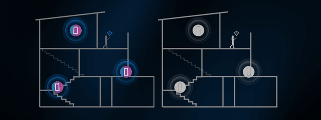 在MESH网络中,WiFi的SSID都是统一的,与传统的无线中继组网方式相比,MESH组网的环境中,设备上网时可以自动寻找信号最好的数据节点连接,并且我们手持设备在不同节点之间移动时,设备还能无缝切换到信号更好的节点上,达到较好的WiFi漫游效果。