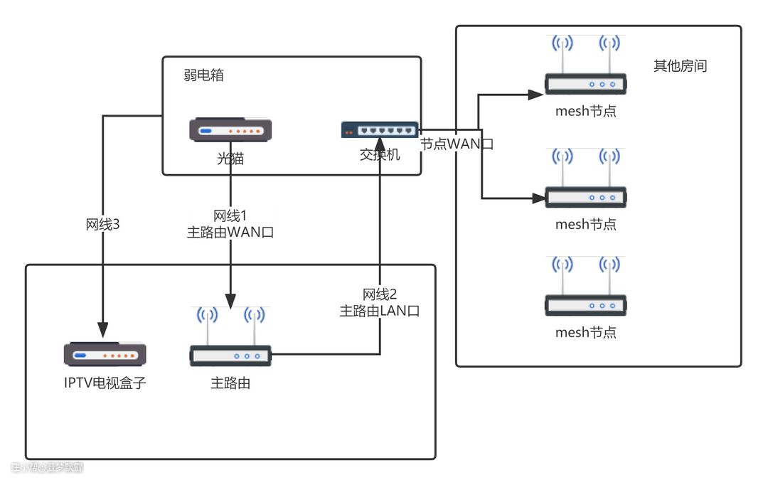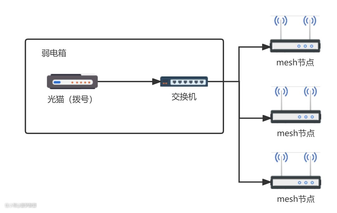 如果自己有小型软路由等设备的话,可以将光猫桥接,通过弱电箱中的软路由拨号,然后进而连接各房间内的AP MESH节点。