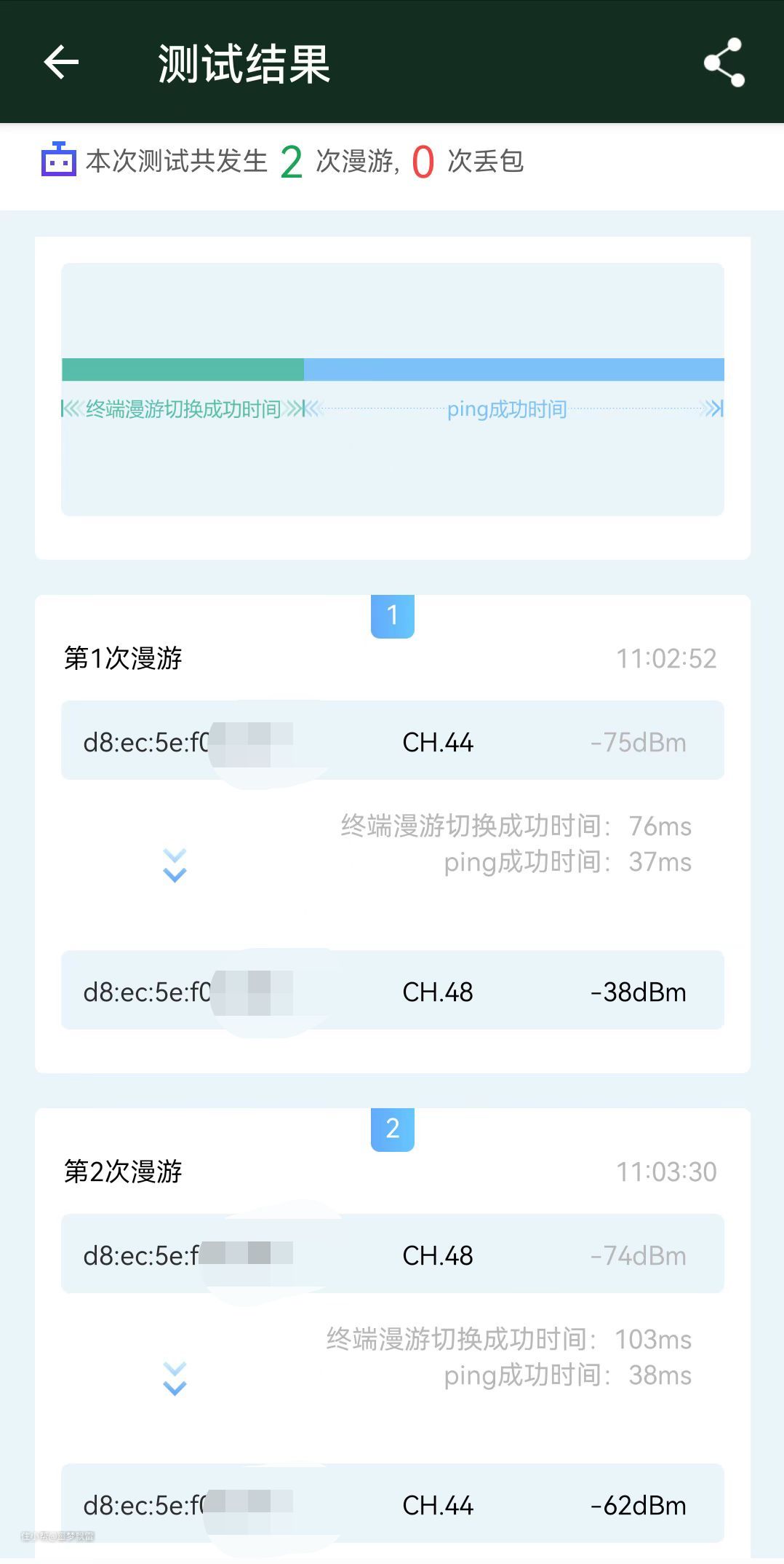 其间发生了两次终端漫游,切换速度在100ms以内,没有发生丢包: