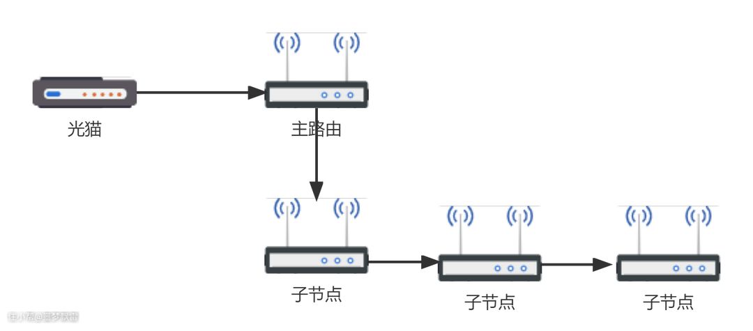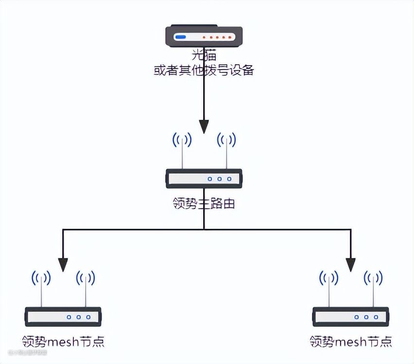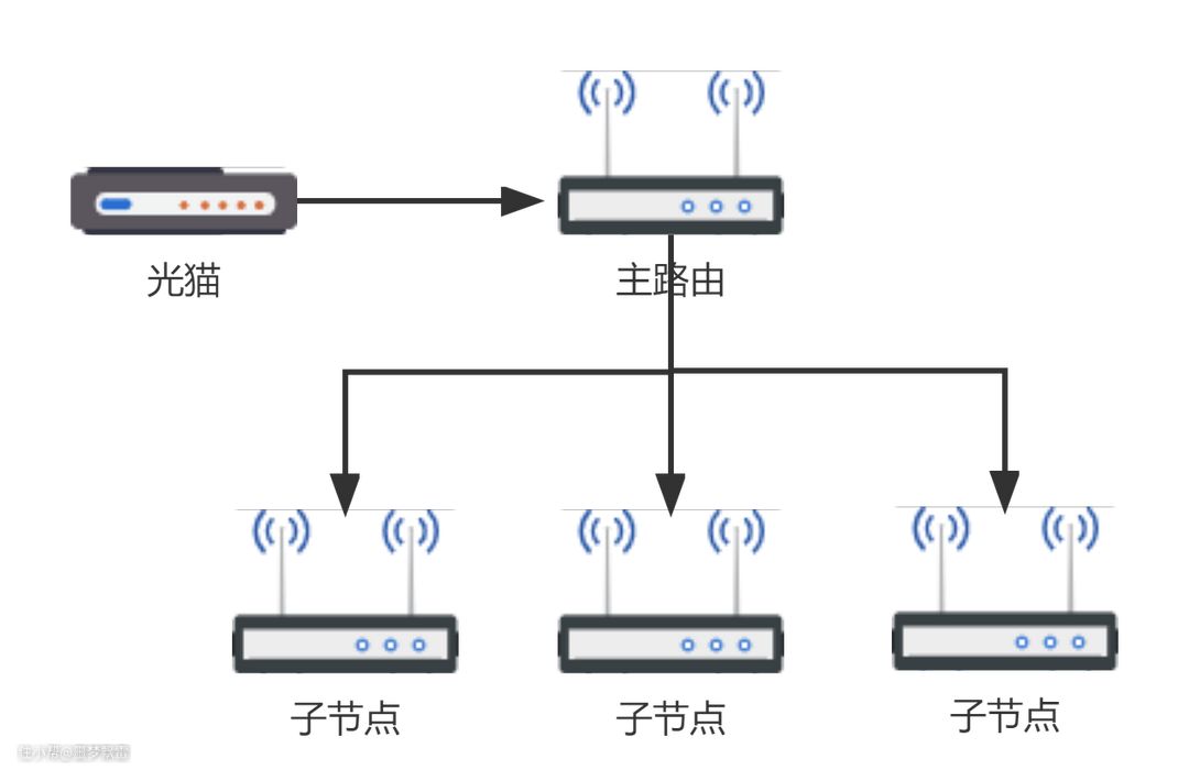 简单来说,就是光猫(桥接)→主路由→MESH节点的结构,同品牌的MESH路由器之间分为了主路由和节点两层上下级关系,网络拓扑图大致如下:
