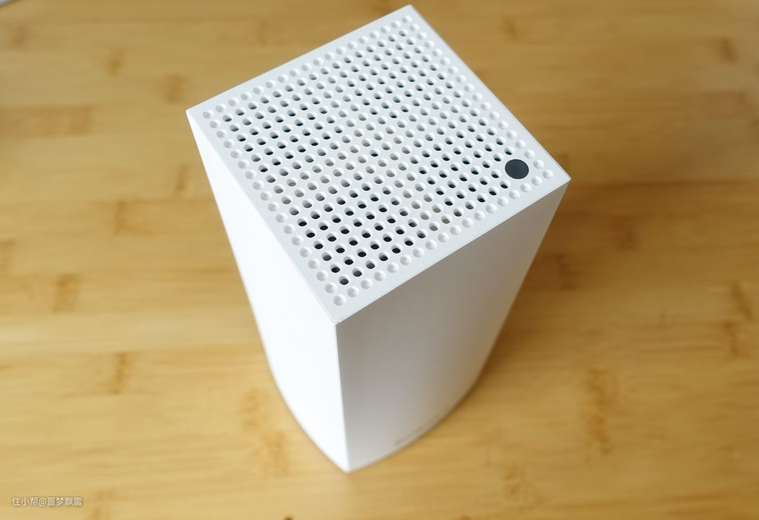 路由器本体为纯白色,表面为磨砂手感,内置天线设计。造型方面是领势Velop的家族特色,并不是规则的长方体,两侧面板为轻微斜面,竖直摆放时有一种收腰的即视感,造型简约不简单,摆放在家里不止节约空间,还很美观。