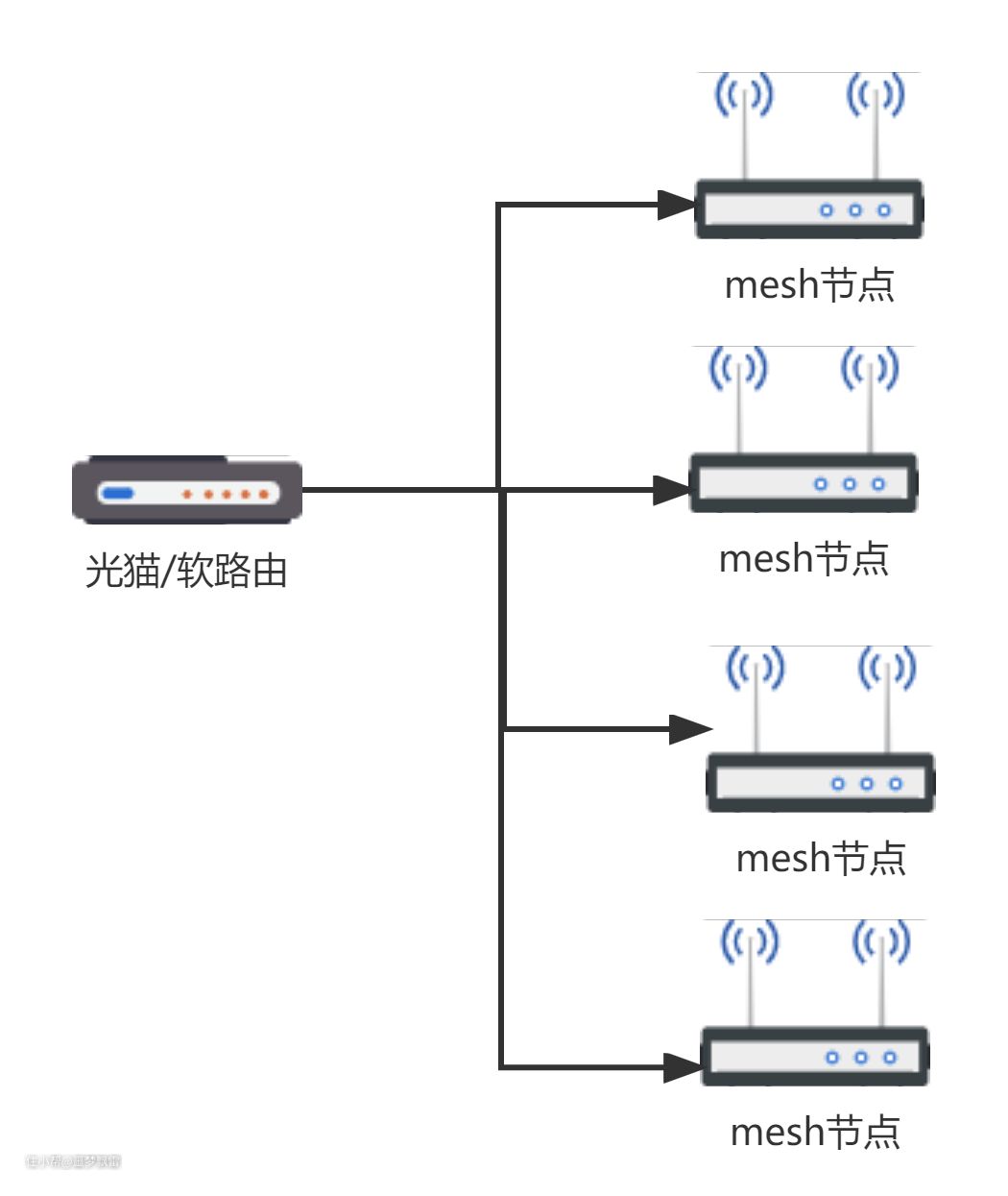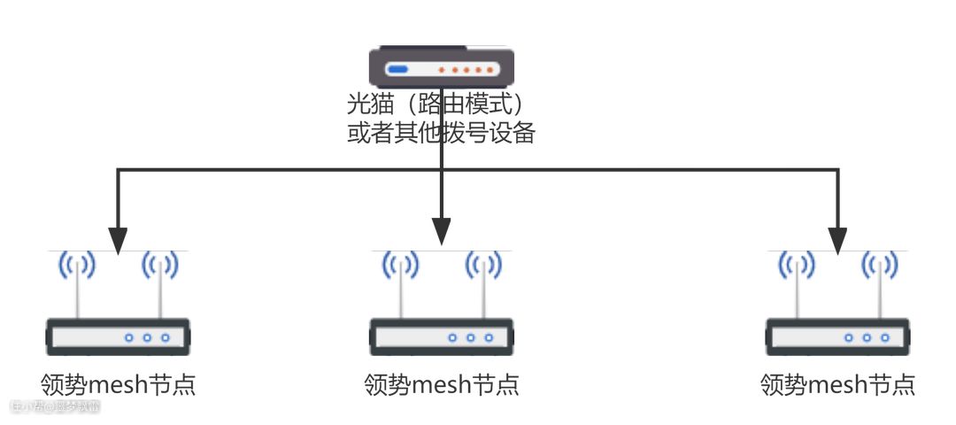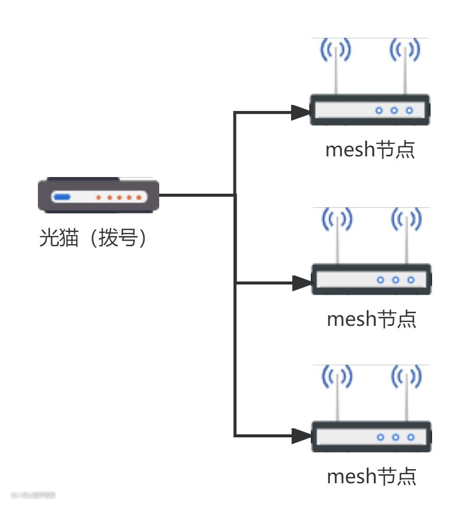 简单来说,就是使用光猫本身作为拨号设备,然后各个MESH节点使用AP模式直接与拨号设备链接,所有MESH节点之间都是平行的关系,并不需要单独挑出一台路由器来当MESH主路由。