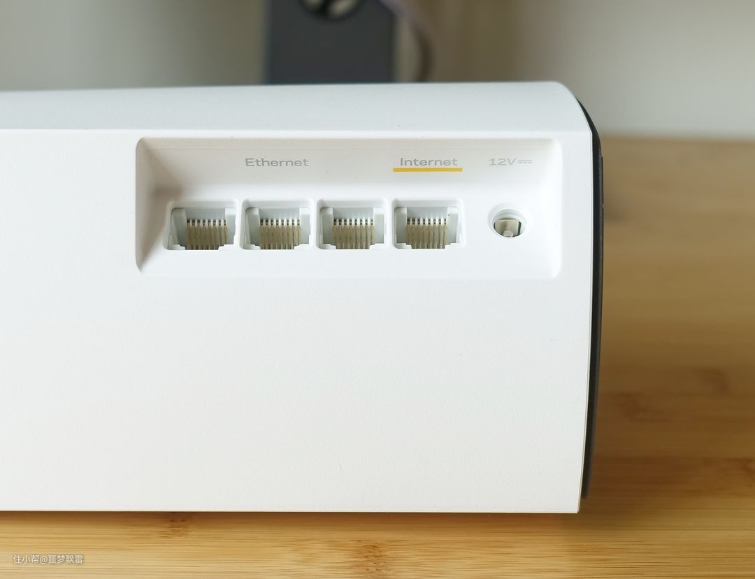 MX2000的网口和电源接口在路由器的右后侧面,采用了内凹设计,可以藏住插头,更加美观。标配了1个千兆WAN口和3个千兆LAN口,作为MESH节点的话基本够用了。当然如果把WAN口给升级为2.5G网口就更好了,可以充分利用WiFi6的高带宽……