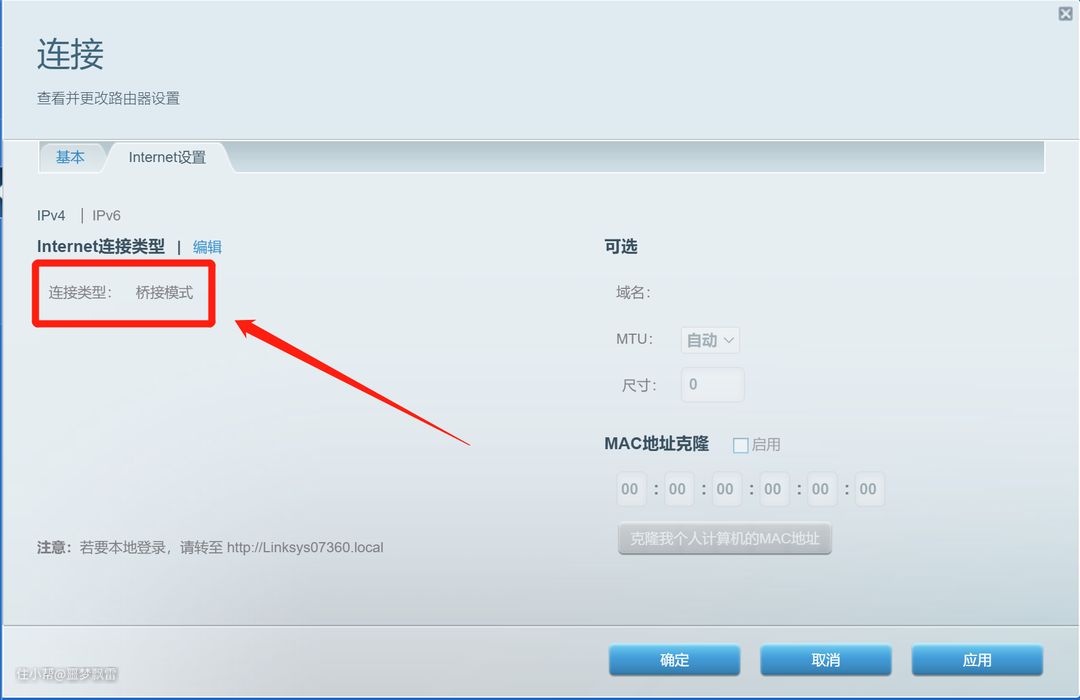 操作方法很简单,MESH组网成功后,只需要设置主路由参数即可同步到其他节点。我们只需要在第一支领势路由器的网页管理端点击 连接——internet设置,然后将连接类型改为“桥接模式”即可: