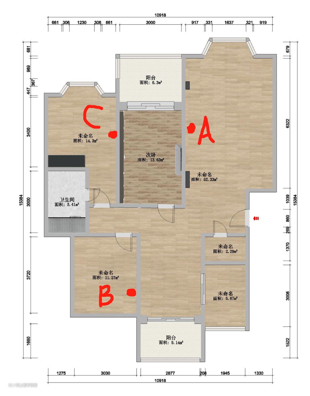 我手绘的上南下北户型图大致如下,测试阶段在A、B、C3点放置了3个节点,覆盖了客厅、主卧和书房三个房间: