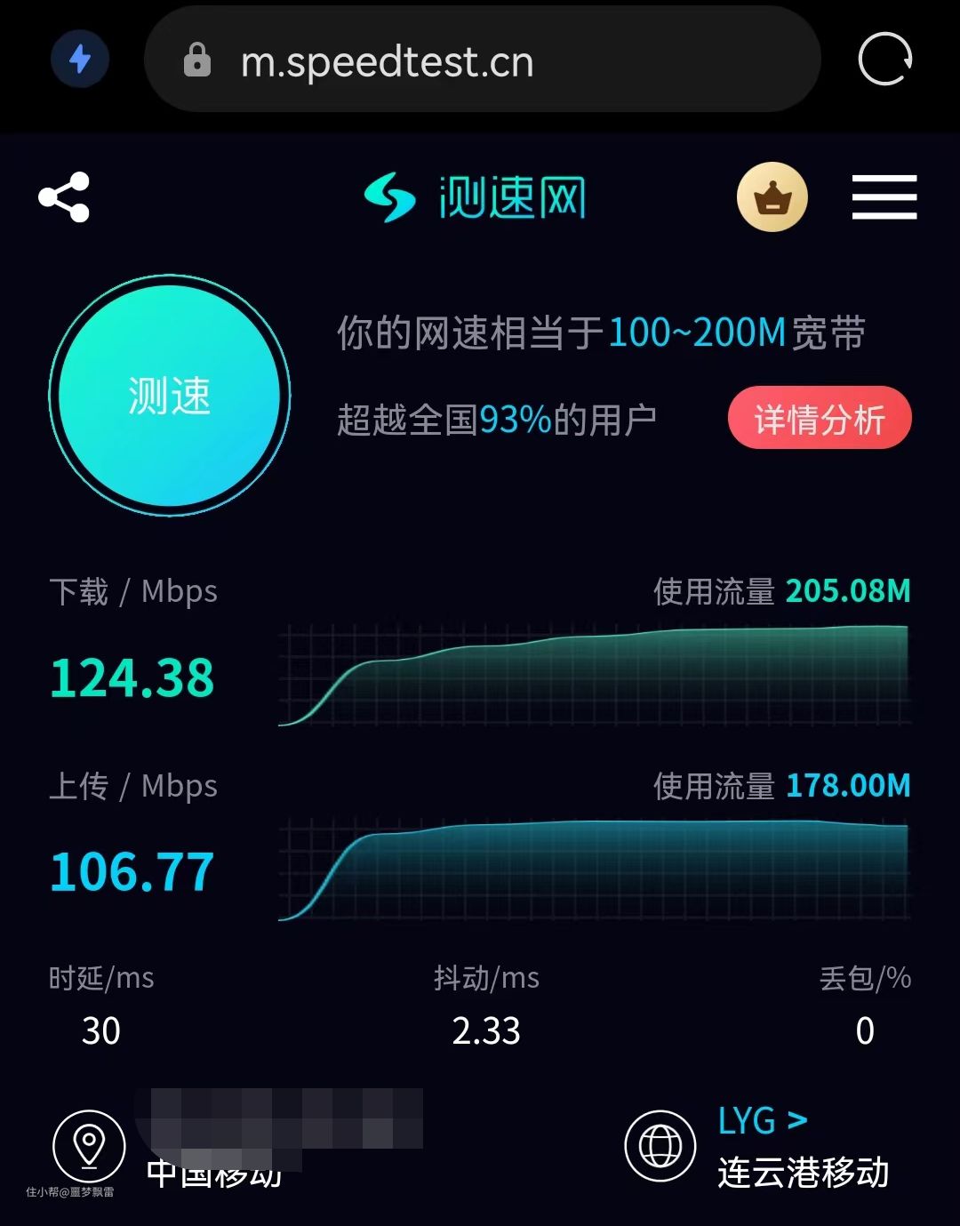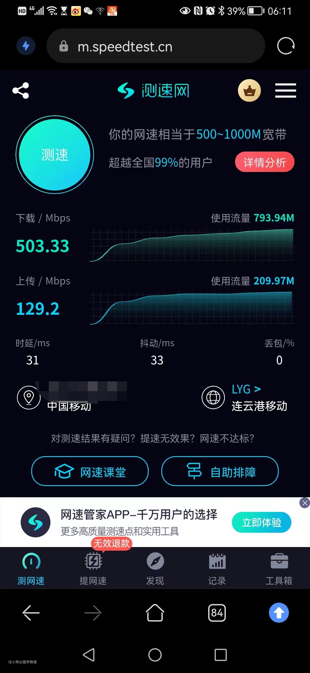 在北阳台等偏远角落,速度有所降低,下行能跑到100多M: