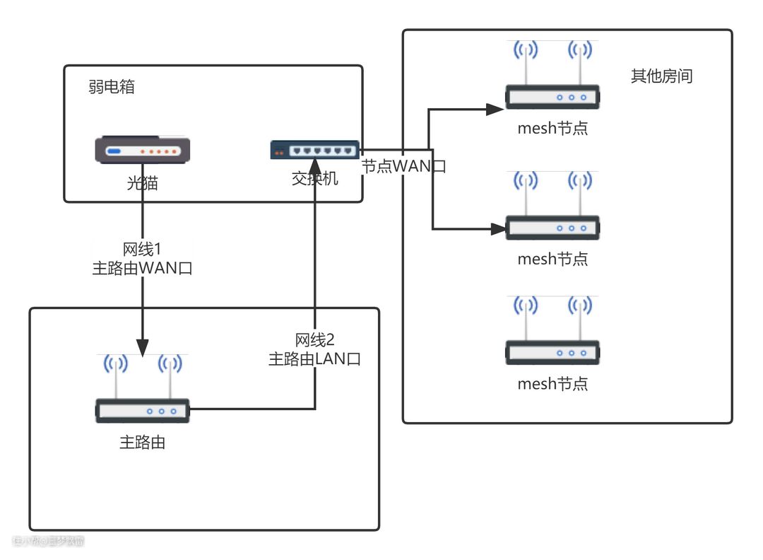 在这种布线方案下,我们可以将拨号主路由放置在某个房间内,通过第一根网线将光猫与主路由的WAN连接拨号,并且在拨号之后通过第二条网线,将主路由的LAN口与弱电箱中的小交换机连接,再由弱电箱中的交换机连通其余房间内的MESH节点。