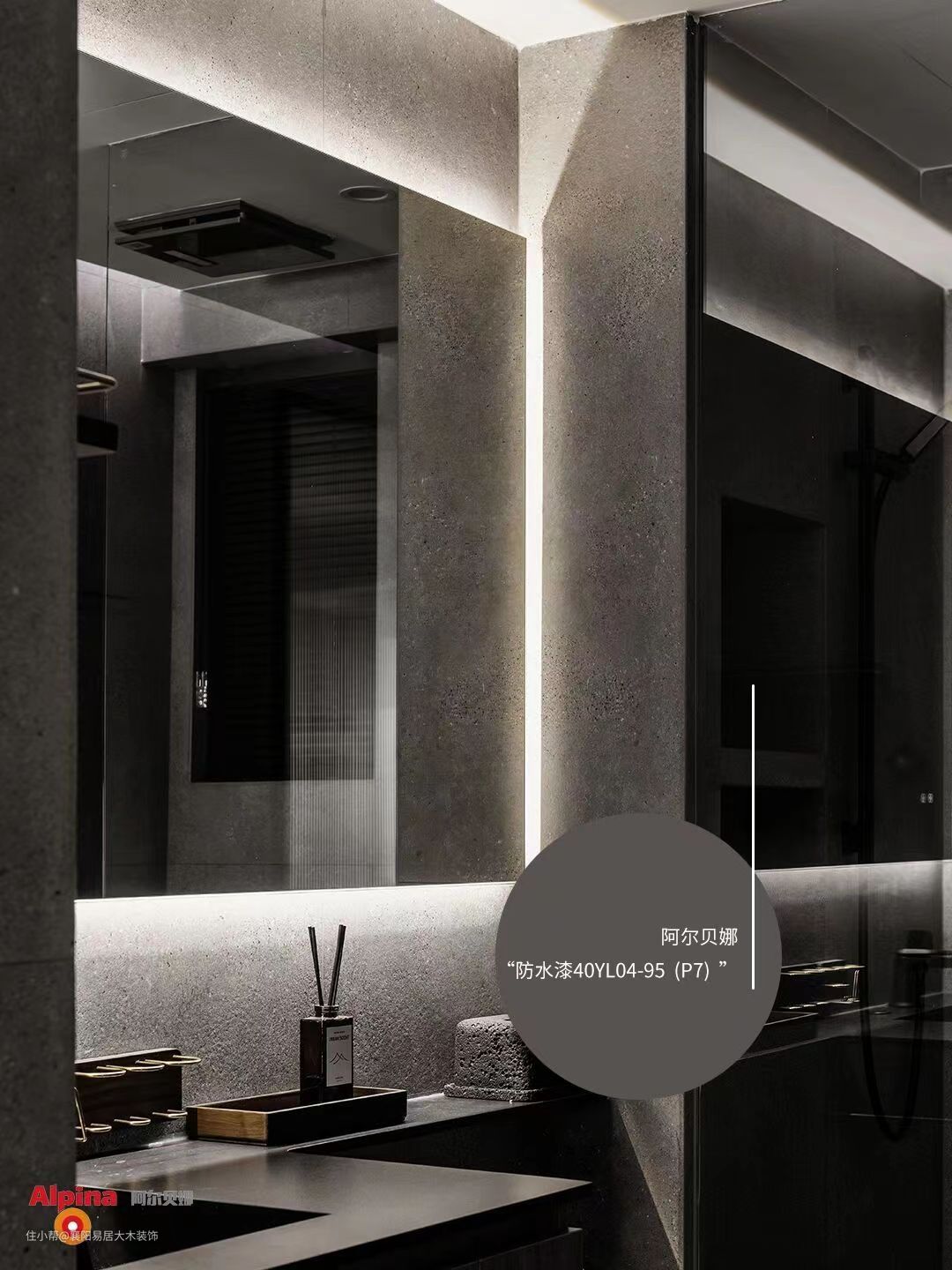 选用▪️阿尔贝娜“防水漆40YL04-95 (P7) ”,搭配雅黑色墙面,加上灯光的聚集,舍去传统卫生间顶面扣板,更显高级感。