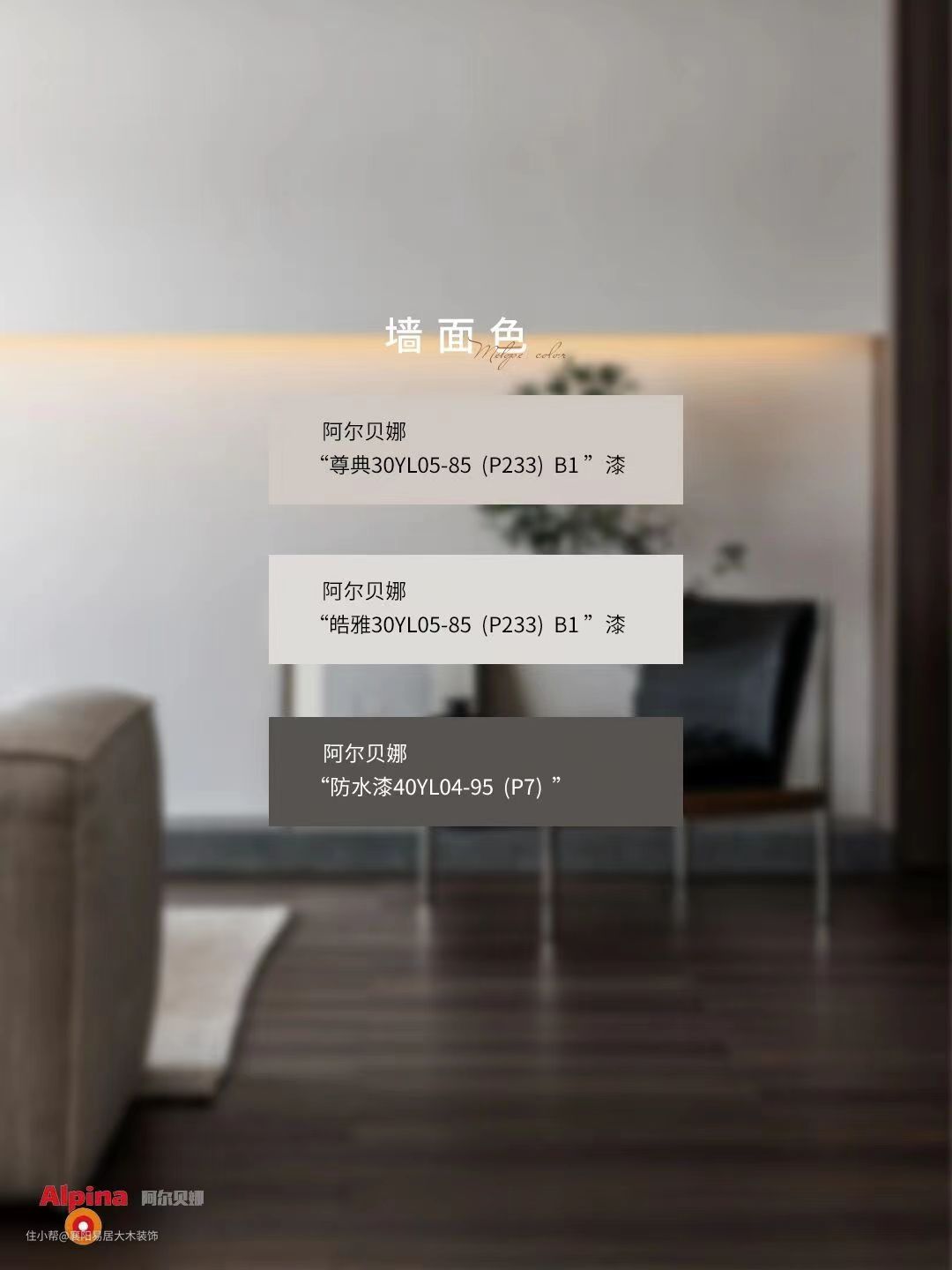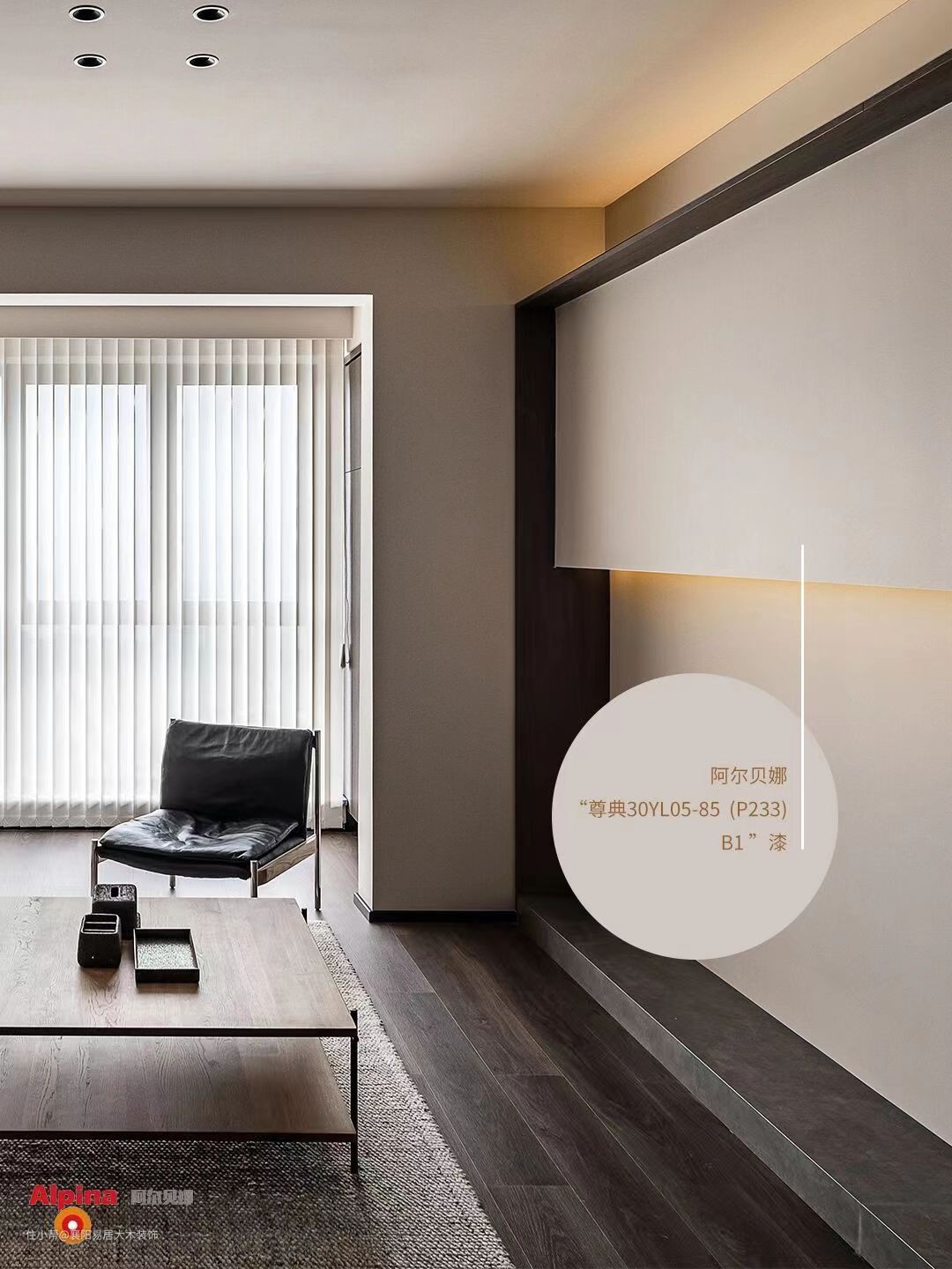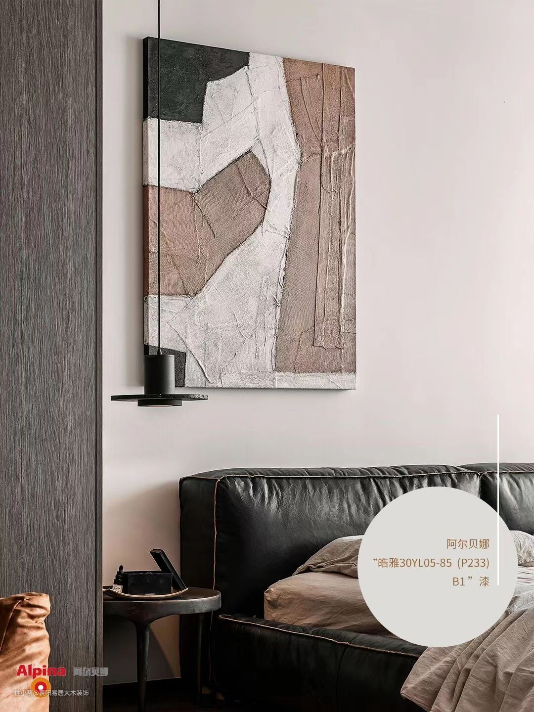 选用▪️阿尔贝娜“皓雅30YL05-85 (P233) B1 ”漆,延续客厅的全屋摩卡浅棕灰色调,将墙面的色彩与黑色质感的沙发融为一体,让空间充满立体感,自然而精致,不失高级感,体现着生活的灵魂。