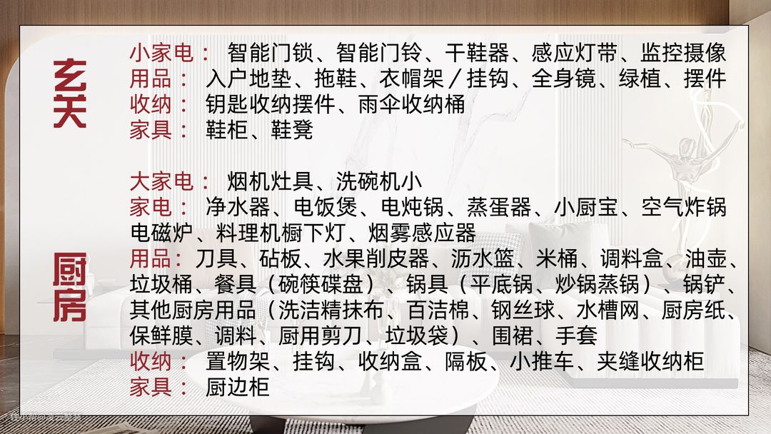 家电的话一般在装修时都会提前买,想要生活精致点,可以入智能门铃、感应灯带,监控摄像;进门后的地垫、拖鞋、衣帽架挂钩、摆件、绿植,以及收纳空间鞋柜鞋凳;