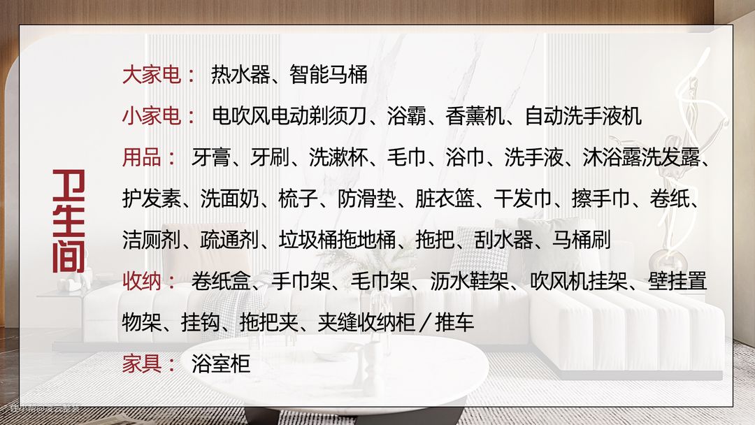 热水器、智能马桶、电吹风、浴霸、洗浴用品、洁厕剂、疏通剂、拖把、垃圾桶、马桶刷等;