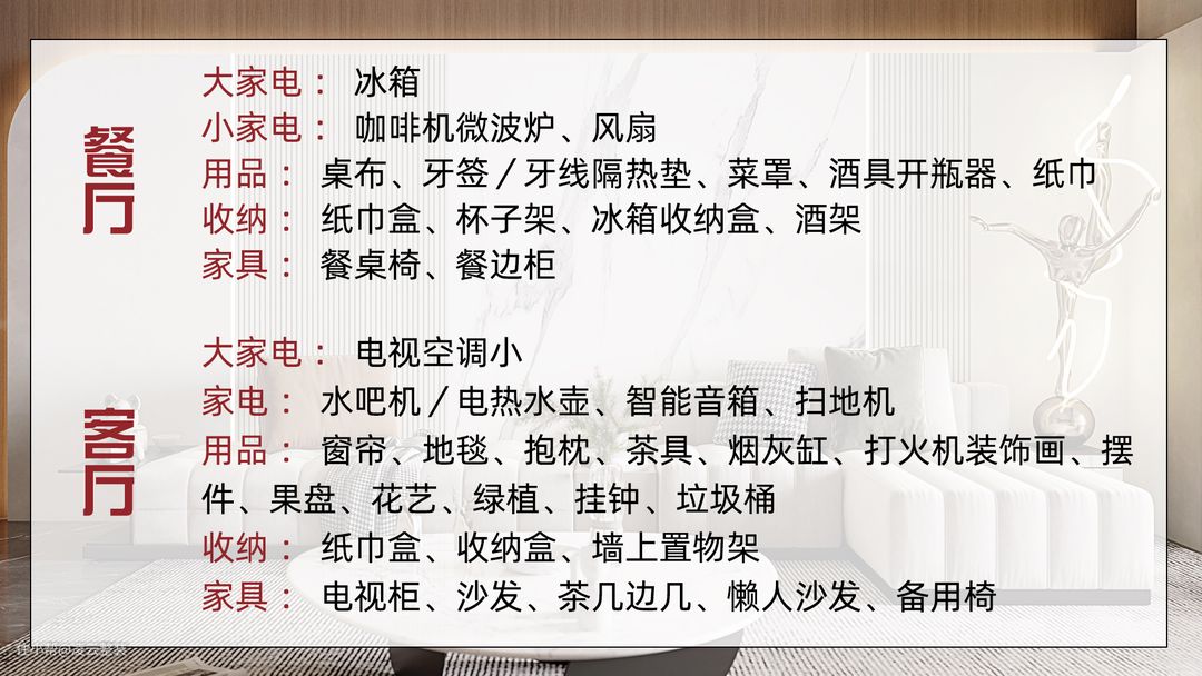 电视、空调、热水壶、窗帘、地毯、抱枕、茶具、烟灰缸、装饰画、摆件、绿植、垃圾桶、纸巾盒、收纳盒、电视柜、沙发、茶几等;