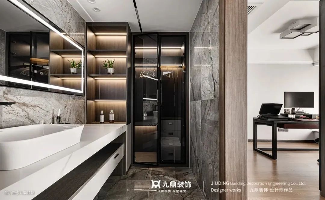 衣帽间衔接主卧与卫浴空间,贯通有序,又展示独特的情调,灯光的烘托更是强化了场景氛围,处处展现着精致的气息。
