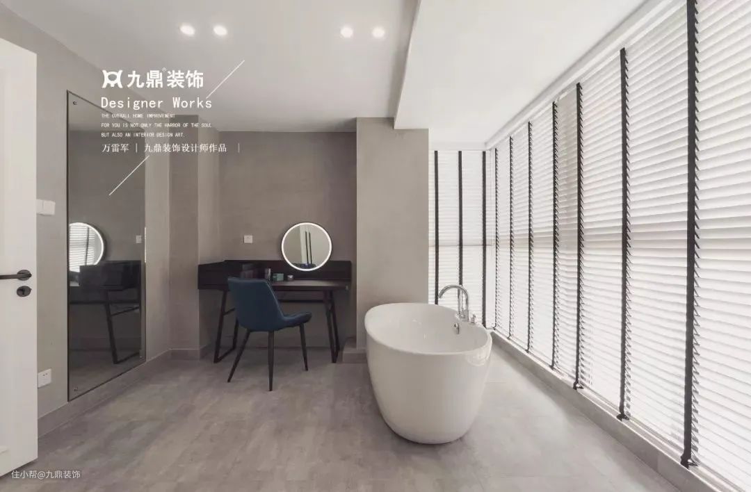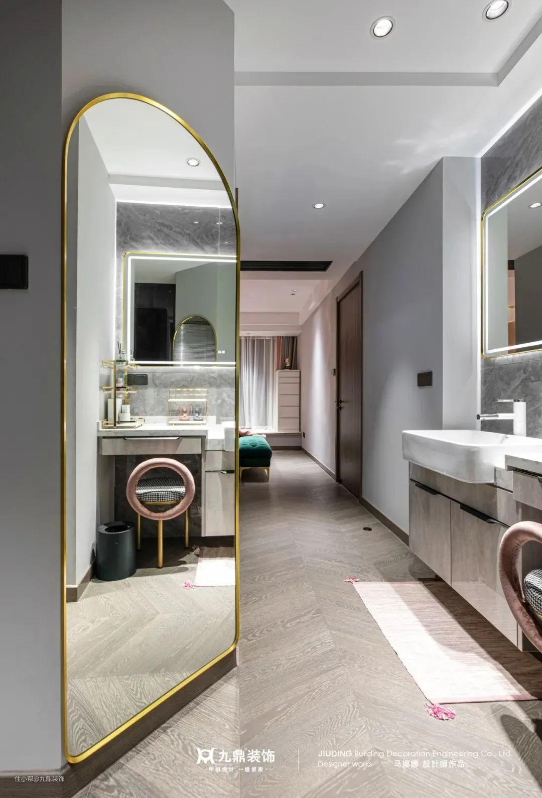 照明方面安装防眩光处理的筒灯即可,如果预留有安装布帘的凹槽,可以用灯槽布置简洁照明。梳妆台、镜子处在墙壁上安装壁灯,减少阴影即可。