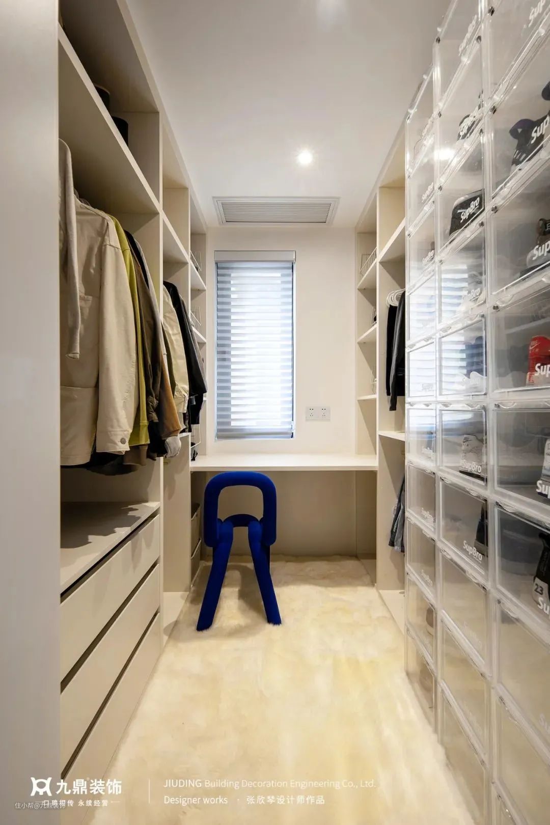 将原来主卫区域设计为U型步入式衣帽间,提供了完美的储物能力,靠窗区域一个简单的梳妆台,既解放了空间,也增加了美感。