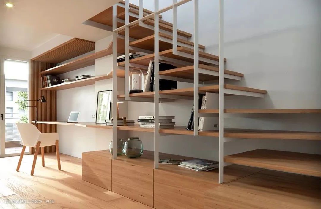 在有较多收纳空间需求的家中,楼梯间下方可以设计作为储藏收纳室;如果居住者有阅读习惯,也可以将下方空间打造成一个小书房或者阅读角;在较大的空间内,楼梯下方可以打造成观景区或是雕塑区,以丰富空间陈设布局。