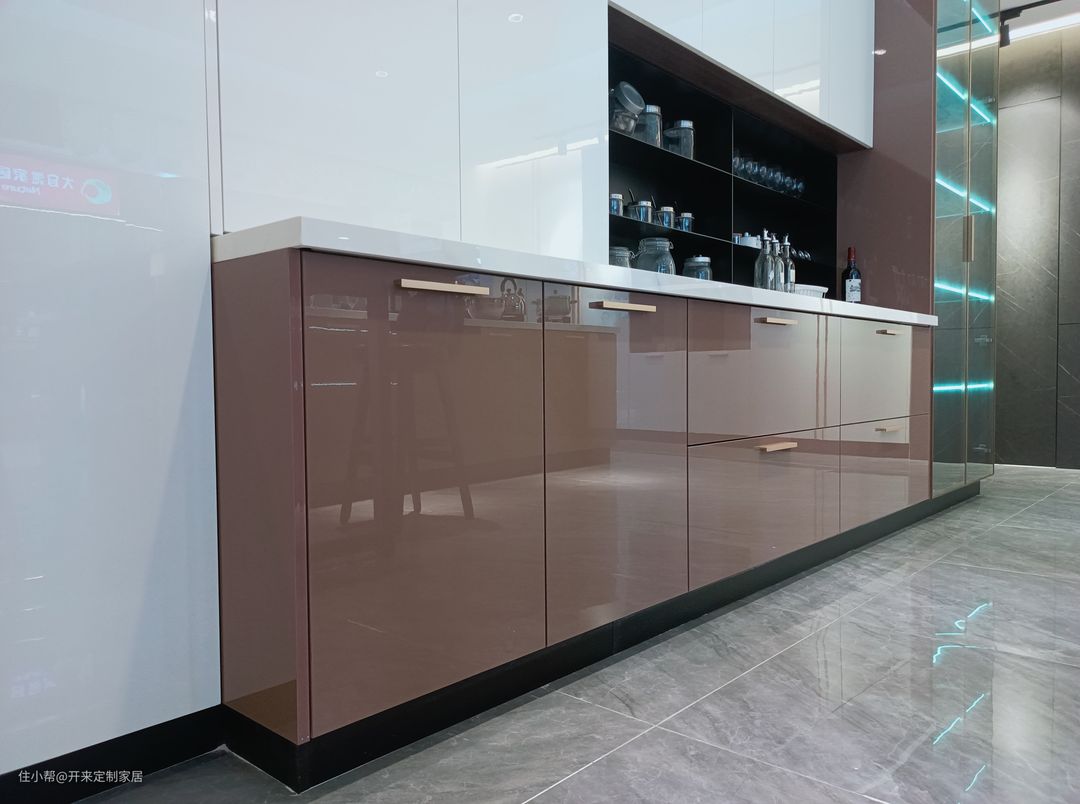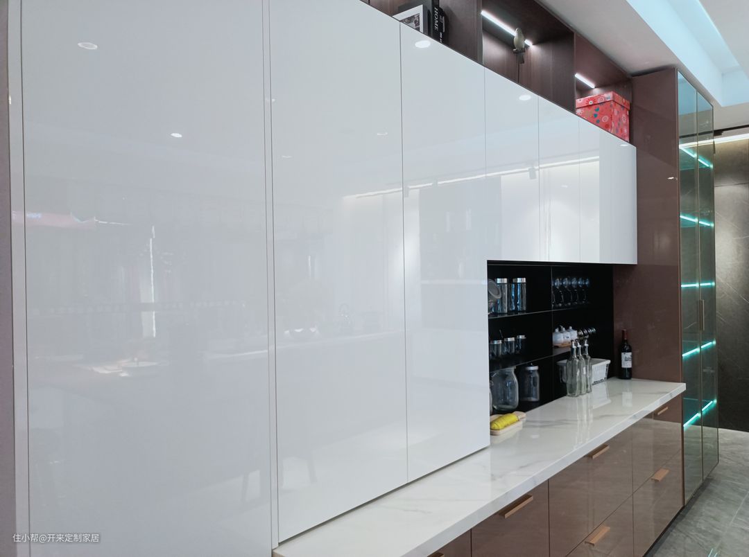 此次厨房案例,采用高光门板结合金丝窄边框玻璃门设计——