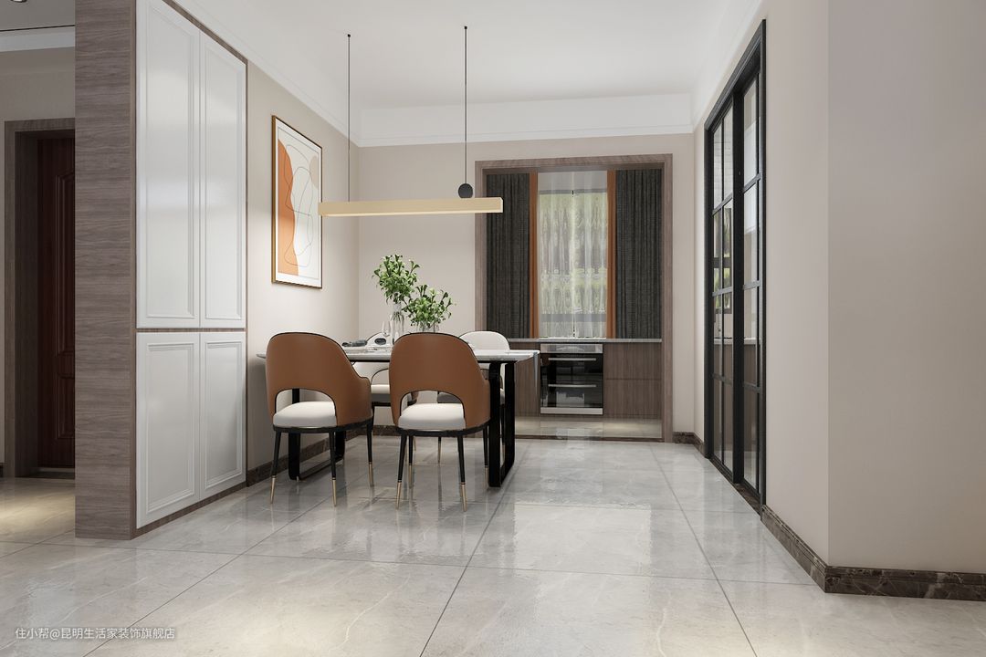 餐厅:餐桌靠墙放,节约了空间又不影响使用。旁边的柜子增加了储物功能,暖黄色的灯光让人心情轻松、愉悦。