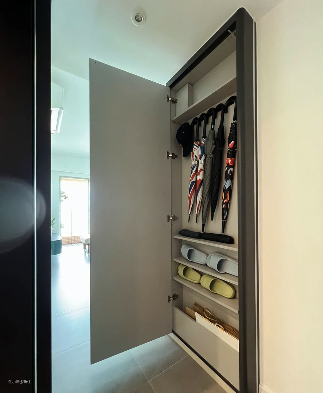 打开,里面是个储物空间,能放雨伞,侧着也大致能放几双鞋子,开拓点思维,其实能放很多东西,比如拆快递的剪刀、口罩……等等这些小物都可以放进去。