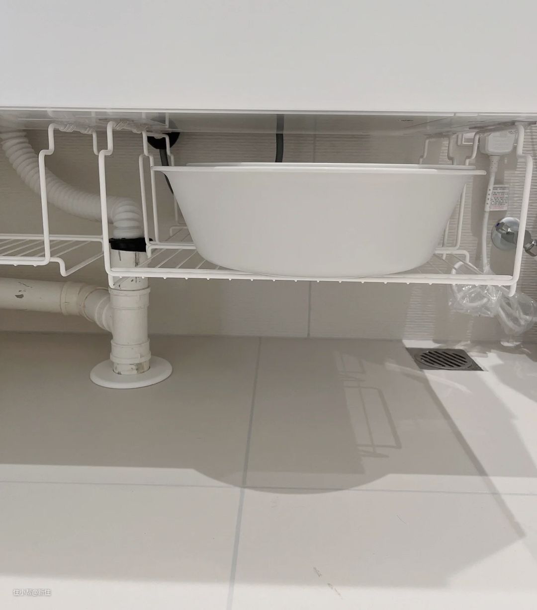 如果做地排,底部就会漏出来排水管,比较不美观。用了这个脸盆收纳方案,刚好,还能起到遮丑的作用。