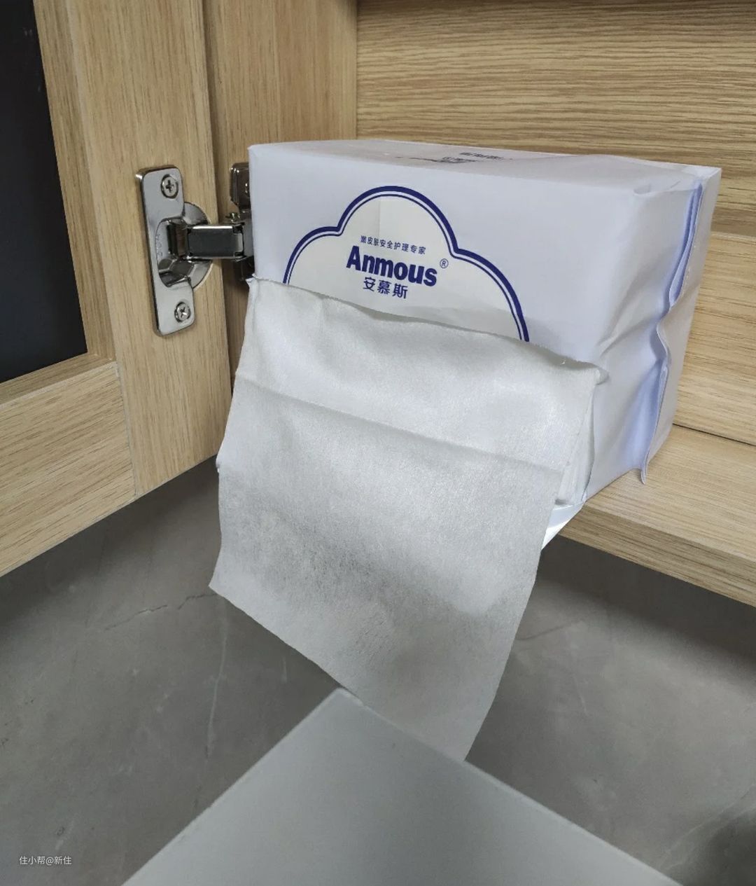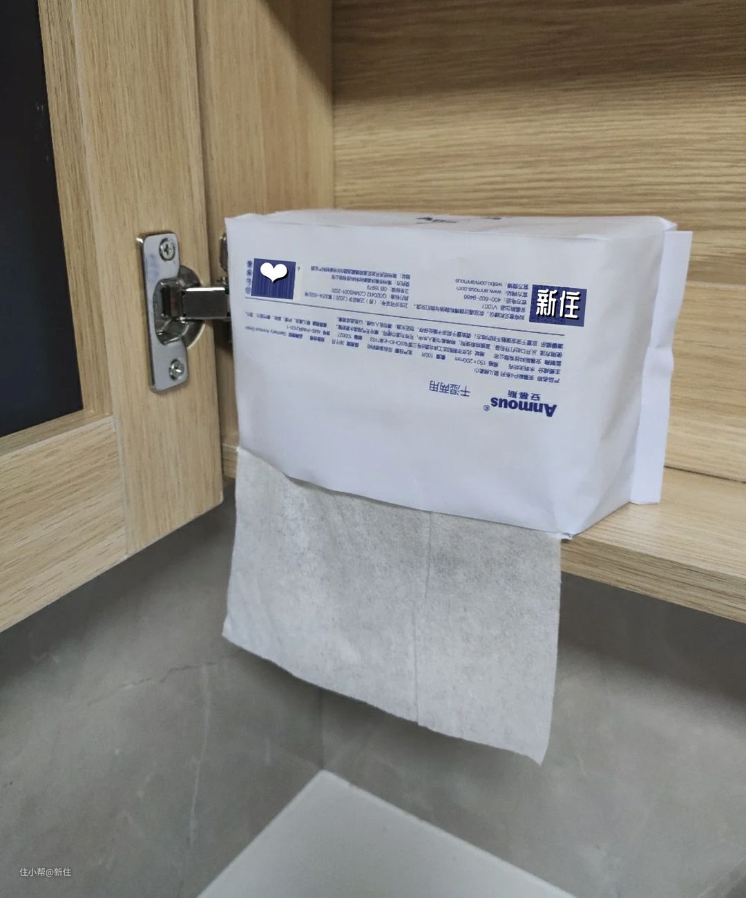 类似的方法,还可用在厨房,放厨房纸,只不过放的地方,从镜柜,变成橱柜罢了,新住的住友们智商普遍180,一定会举一反三的。