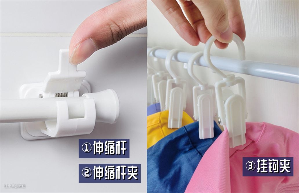 实现起来,很简单,需要三个物件,分别是伸缩杆、伸缩杆夹和挂钩夹。