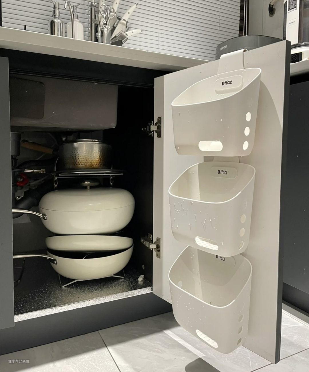 当然,不仅局限于用在厨房橱柜的柜门上收纳葱姜蒜,还可以挂在衣柜柜门上、餐边柜柜门上,去收纳不同的东西,思路给到了剩下的靠自己。