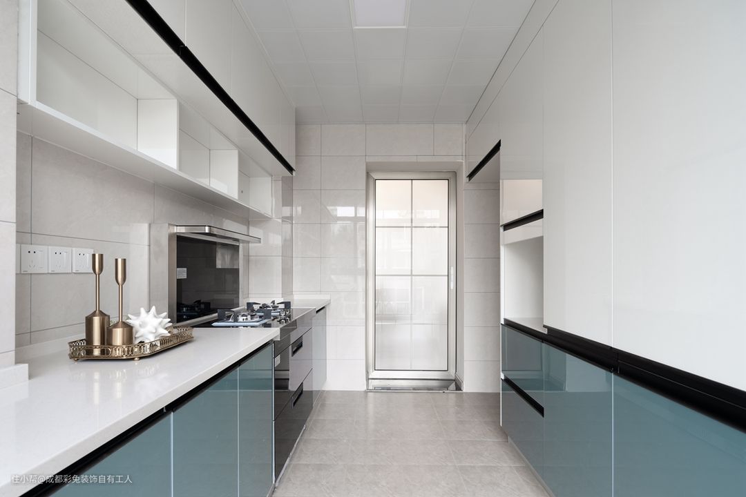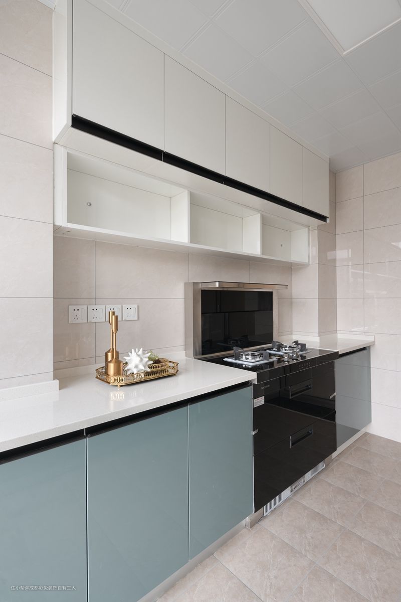 2、下方橱柜采用浅蓝色,上方橱柜采用白色