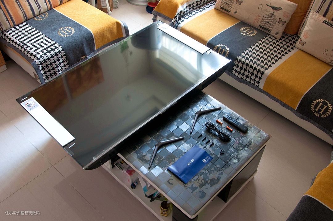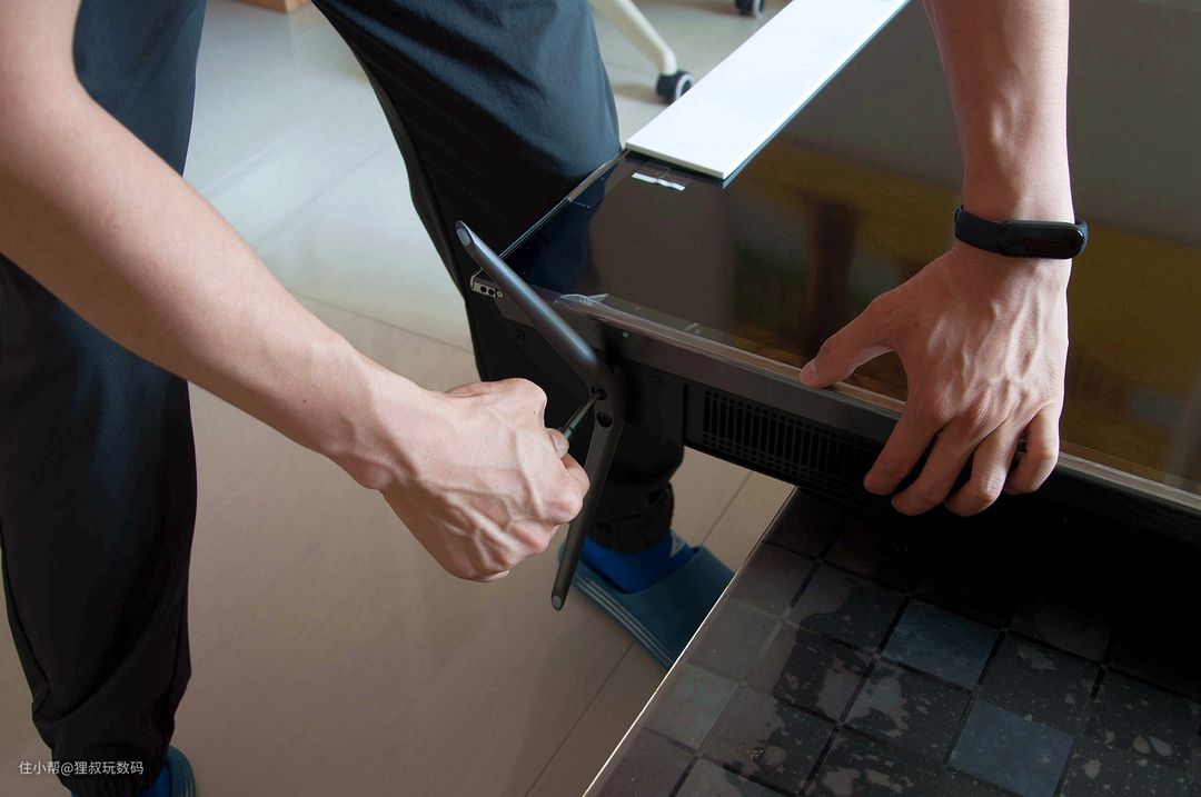 拆箱后按照说明书指引装入两根“外八”支脚,并用螺丝固定,再通电联网就能正常用了,超级简单。支脚与电视的连接位置设计有限位装置,可帮助大家快速定位组装固定。