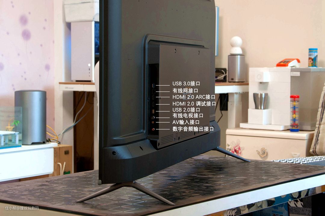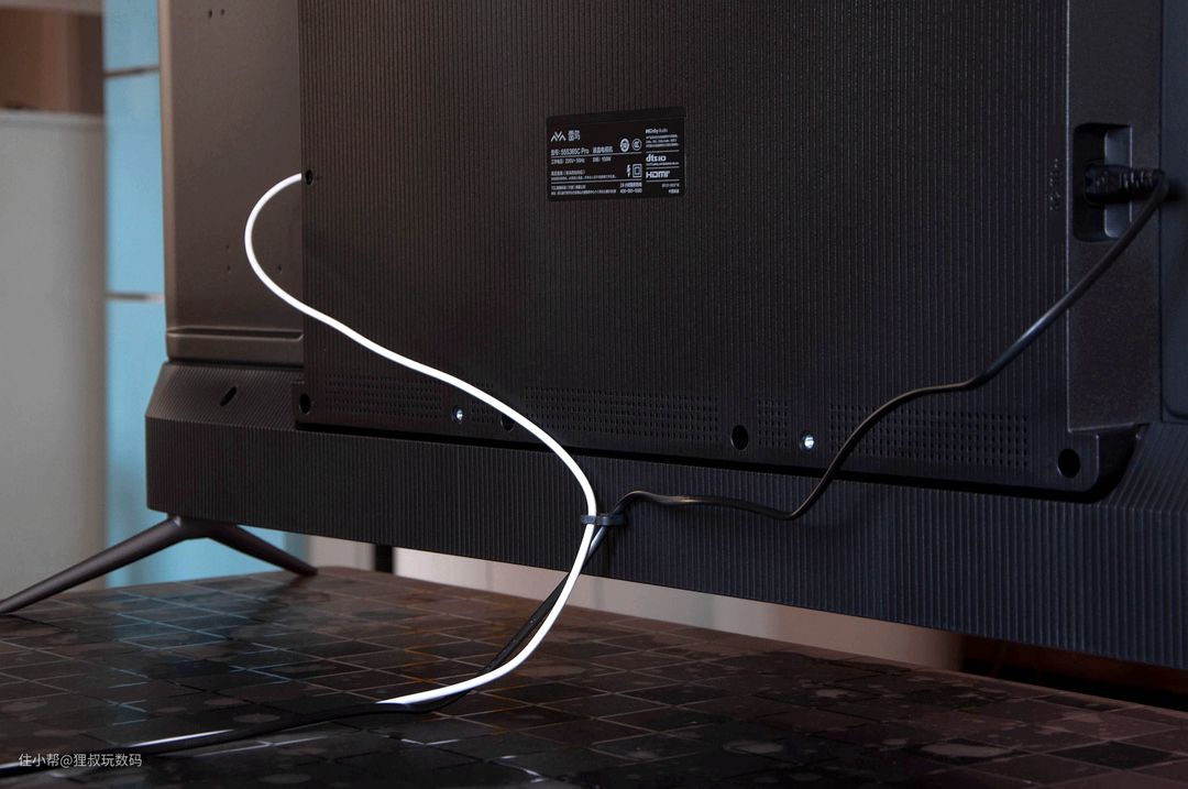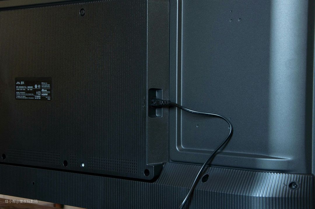 这款电视的配件中包含一枚理线卡扣,我们可以将其装入电视背面底部的孔内,将两侧的线材同时从卡口内排出,无论是挂装还是座装都很美观。