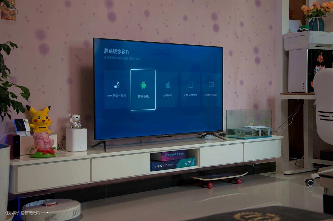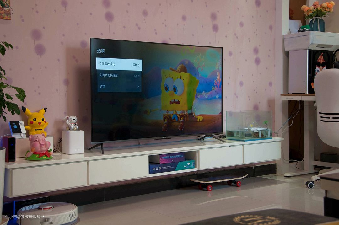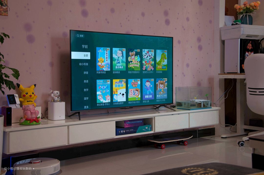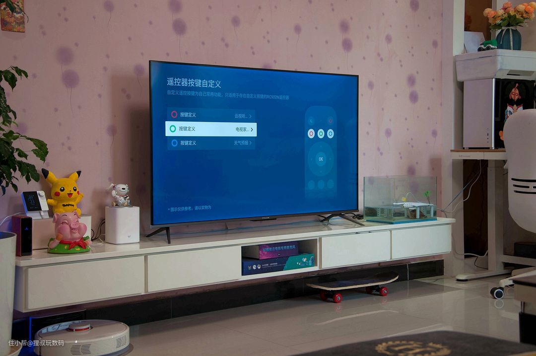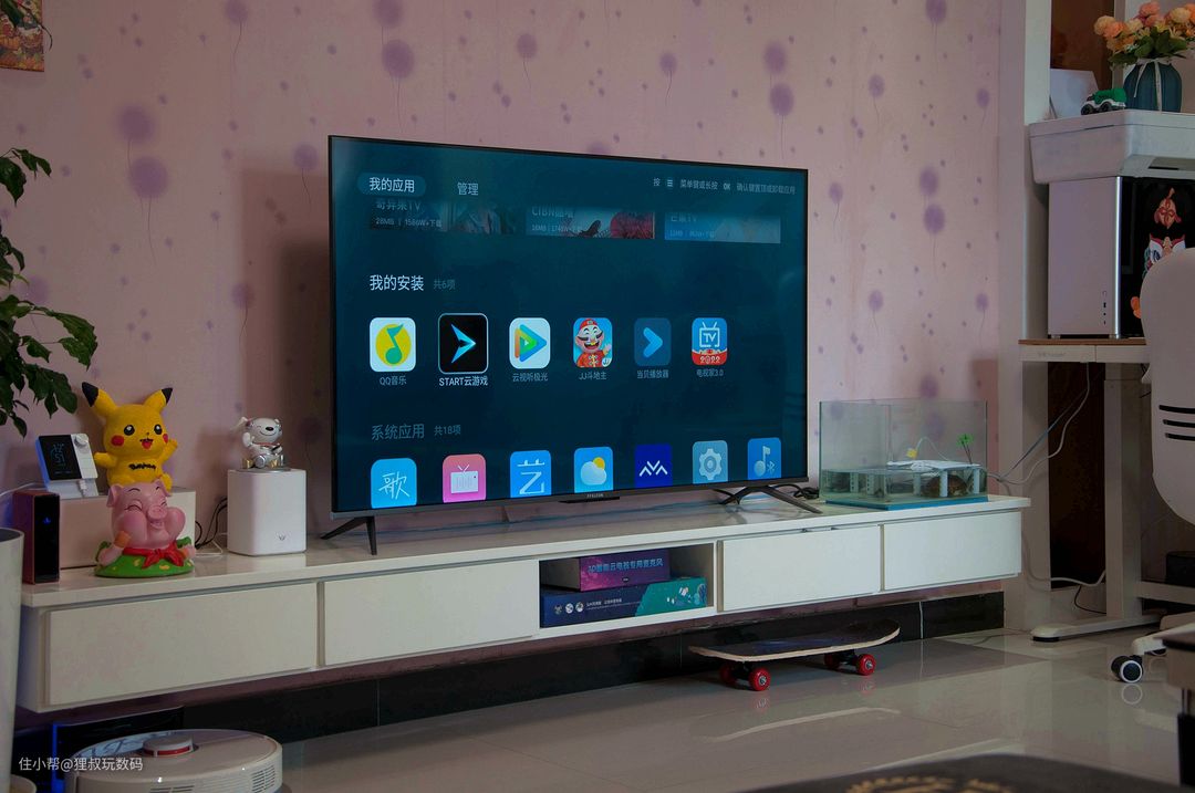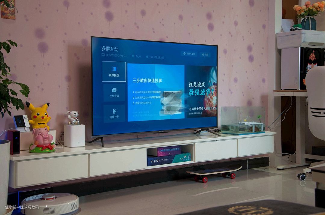 我家电视柜的长度是244厘米,把雷鸟·鹏6智能电视55寸版放上去后还蛮协调哈。我截了几张图大家先睹为快哈,包含:游戏中心、查天气、微信互联、投屏、技能教学、音箱模式、本机信息、电视助手、声音效果等。看到第三张图片的消息弹窗了吗?和微信互联后可以通过“TCL微电视”微信公众号向电视发消息,比如提醒孩子休息啥的都很方便。