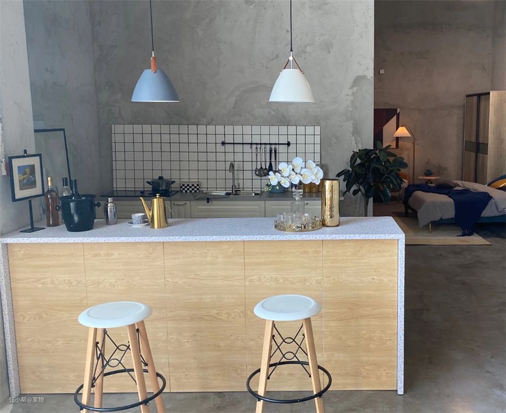家里的厨房区域采用了开放式的格局设计,与客厅、餐厅相隔断的吧台,直接选择了原木色调,看起来干净明快,也避免了一水儿深色调给家中带来压抑感的问题,搭配水泥毛坯房相得益彰。