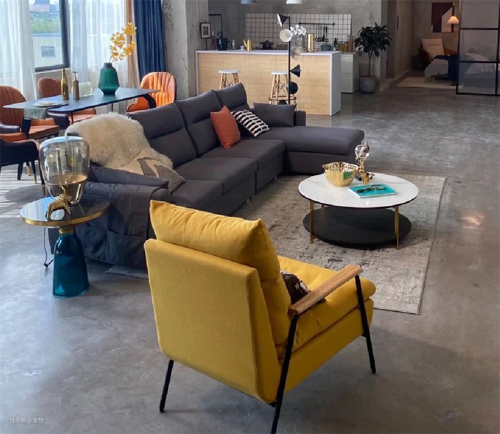 说回沙发这里,沙发选了这种深蓝色的科技布材料,看起来很有质感,而单人沙发则是明黄色的,与主沙发形成鲜明对比,同时也中和了水泥毛坯房空间里的冰冷感,看起来颇具活泼之感。