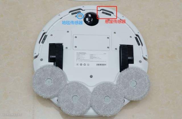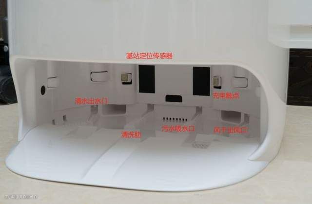 ▲360小章鱼拖地机器人底部还具有地毯传感器与悬崖传感器,可以避免其弄湿地毯或从高处掉落。说完机器人本体,我们再来说一说基站: