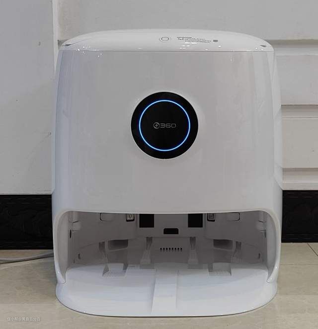 ▲360小章鱼拖地机器人因为无需自动集尘等功能,因而基站只需清洗拖布模块与清水箱、污水箱,因此高度比较低,观感上不会产生压迫感。