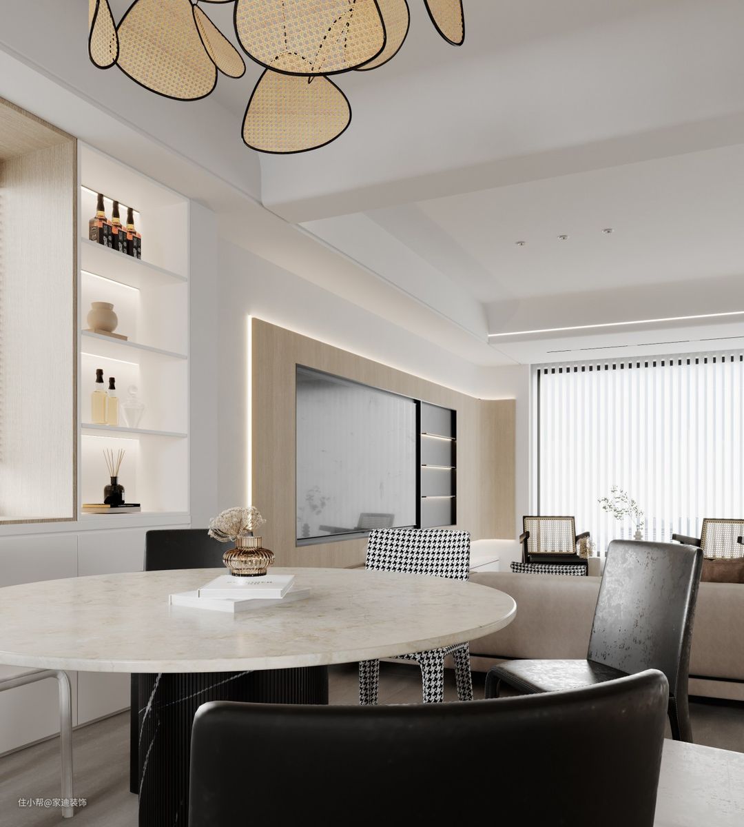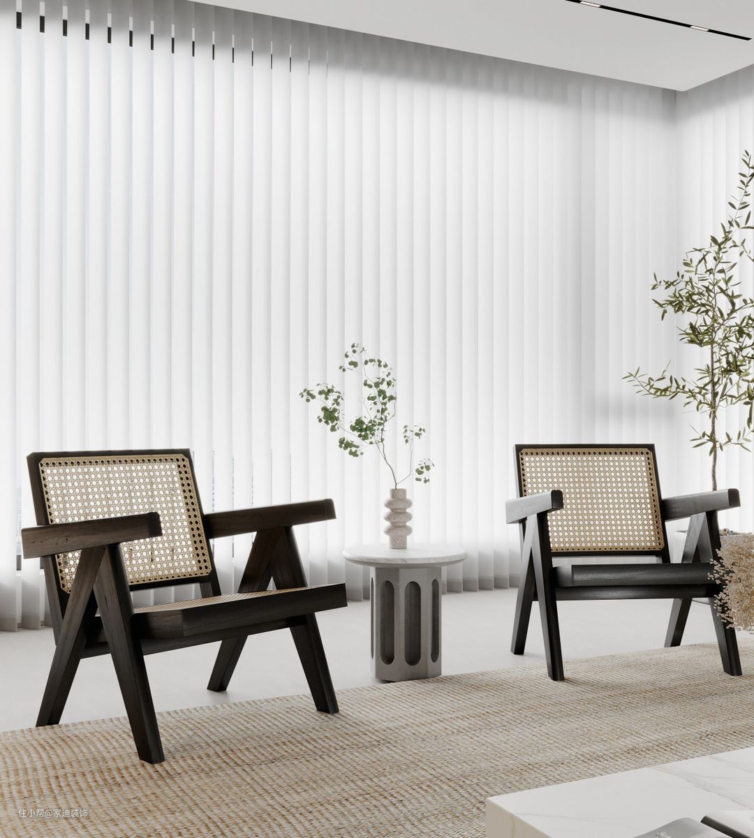 客厅休闲区域有两个竹编的黑色原木椅子,使整体的风格十分的温馨舒适。
