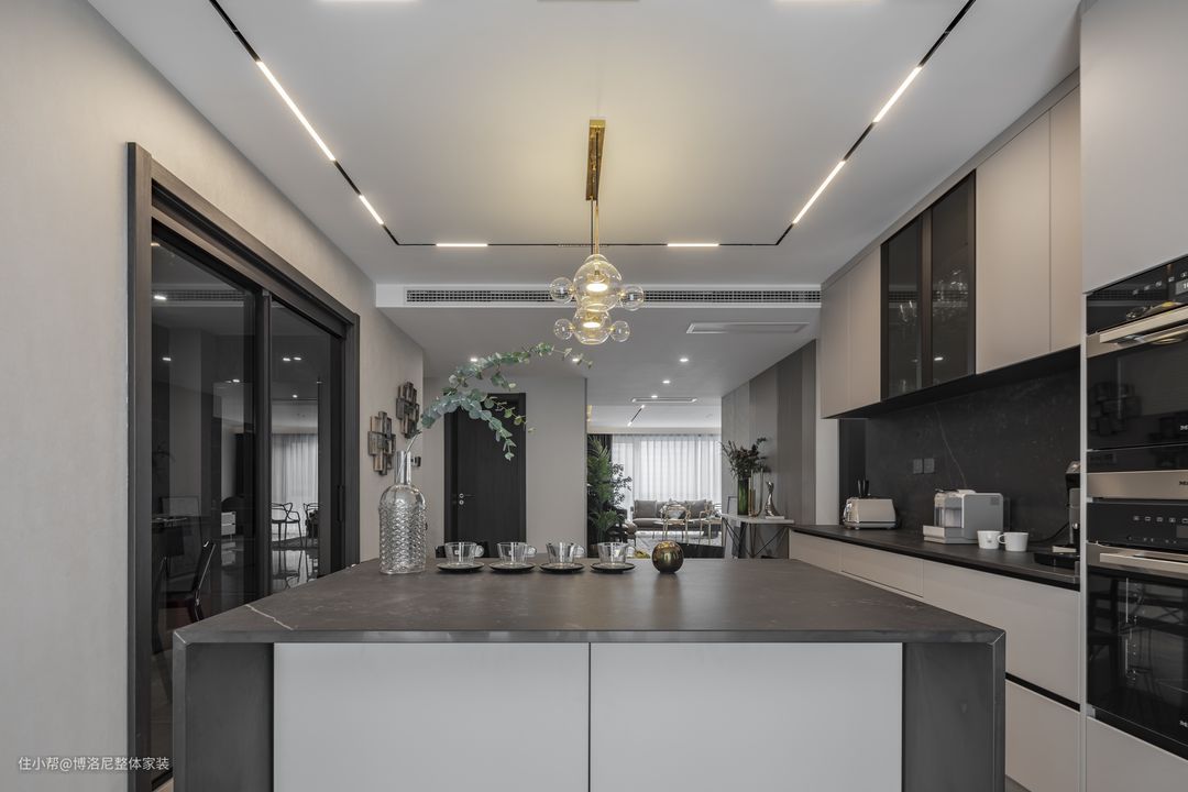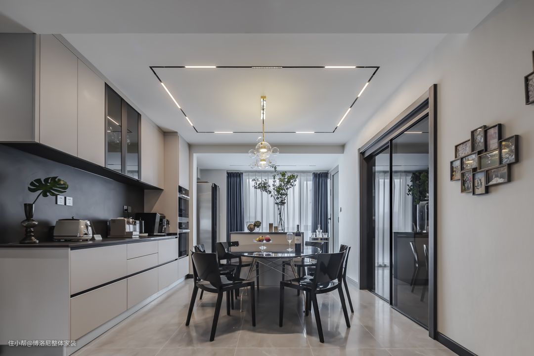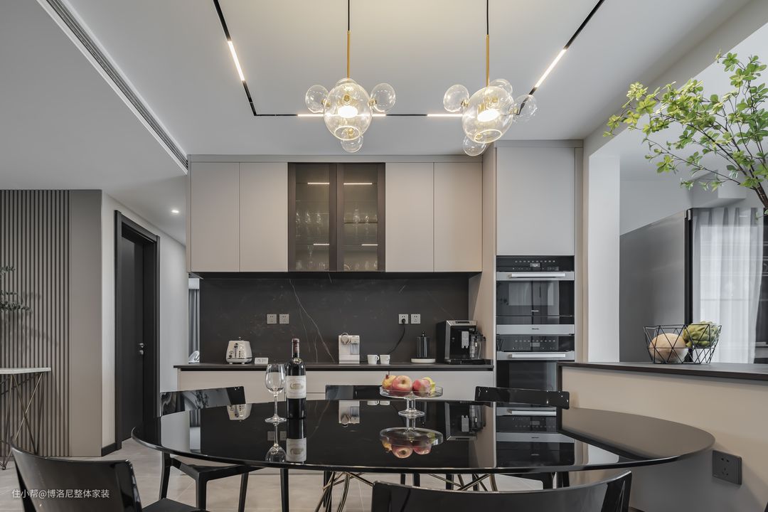 餐厅:功能划分的很明确,餐边柜也非常优雅大气,也结合了西厨房的功能,使用起来非常方便,黑色餐桌椅显得高级感十足。